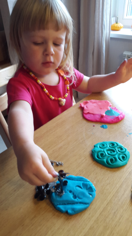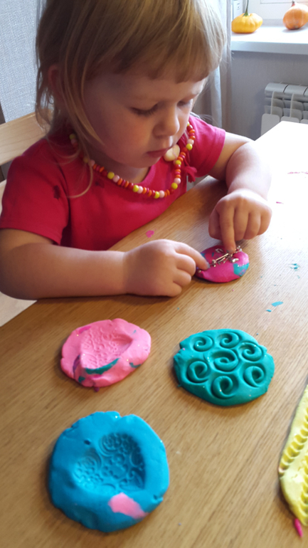 Развивающие игрушки своими рукамиПластилин сколько не лепи, никогда не надоест! Летом мы лепили мало, тк дача, улица, природа, а вот как только похолодало, опять вернулись к поделкам и лепке. Надо заметить, что Play Doh сильно подорожал из-за курса валют, поэтому купить наборчик теперь становится в 2 раза более радостней, тк реже! Увлеклись мы изучением фактур. Я достала свою бижутерию -бусы, брошки, кольца и даже кусочек кружева и мы принялись изучать отпечатки! Я увлеклась с Машей так, что не заметила, как пролетел час!