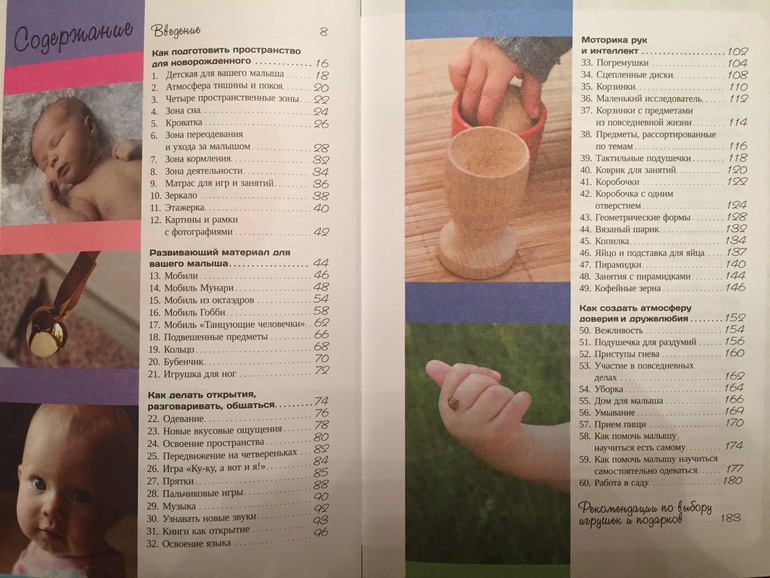 Знаю, что некоторые матерые монтессорщики считают ее примитивной, для начинающих. Ну и что! Вот мне она как раз попалась в начале моего пути. Мы все сначала "чайники" в чем-то. Можно пуститься в полемику, что как таковой монтессори педагогики нет для возраста 0-3, а книга именно его захватывает, но можно просто глянуть практическую часть метода и сделать для себя вывод: близок тебе подход или нет. Для меня главная идея книги:" У каждого ребенка свой собственный, только ему одному присущий ритм развития, так что именно вам будет виднее, готов ли сейчас ваш малыш к тому или иному виду деятельности..."