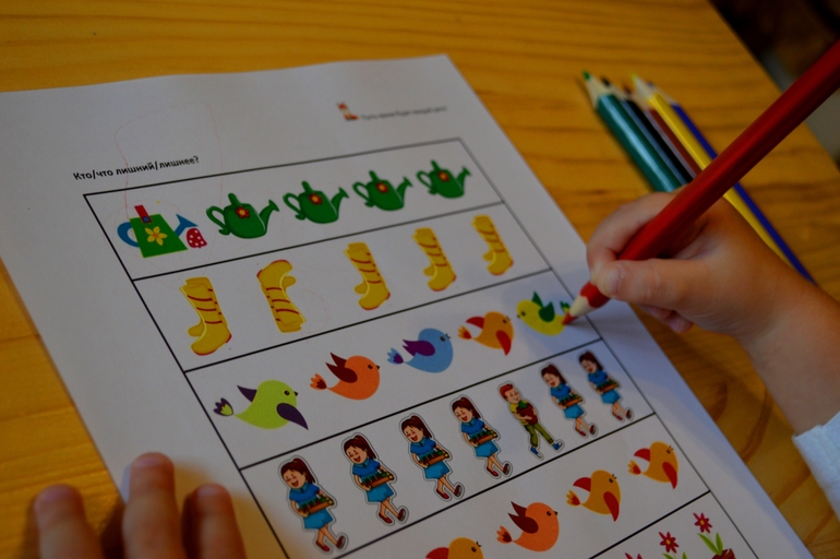 7. Найди лишнее. Игры, которые заключаются в том, чтобы в ряду одинаковых изображений найти то, которое отличается от других. Катюша сама еще редко выполняет такие задания, в основном я делаю подсказки об этих отличиях, например,
