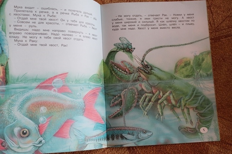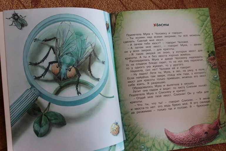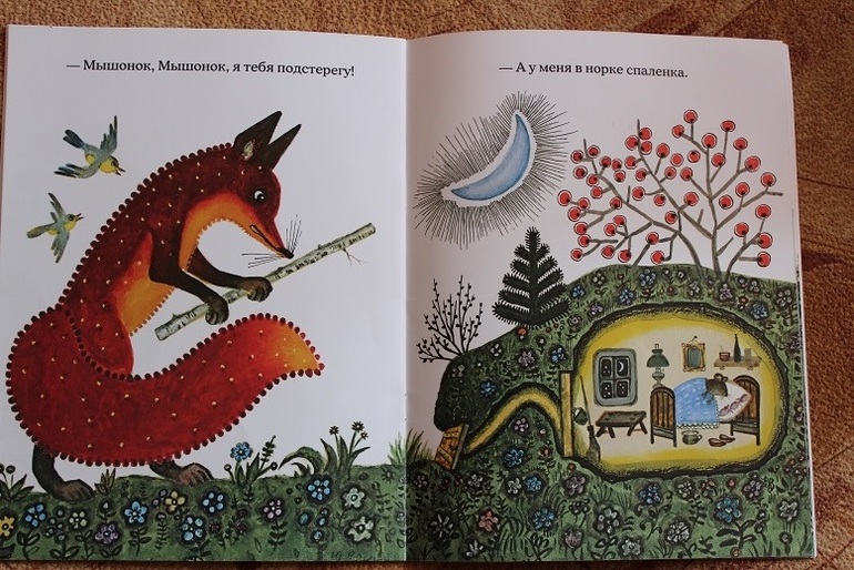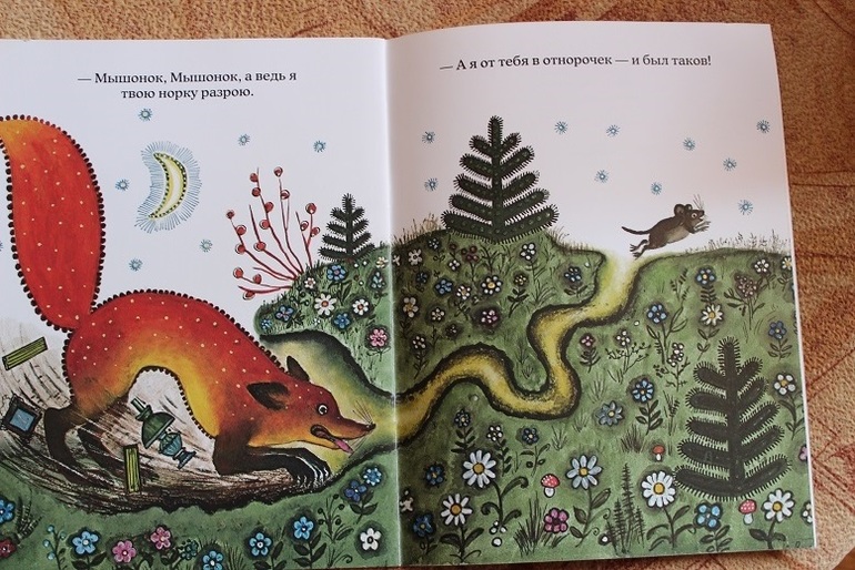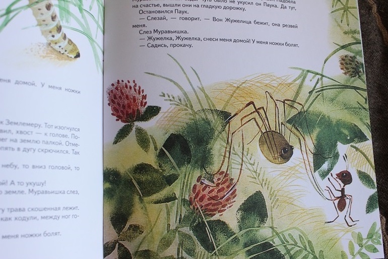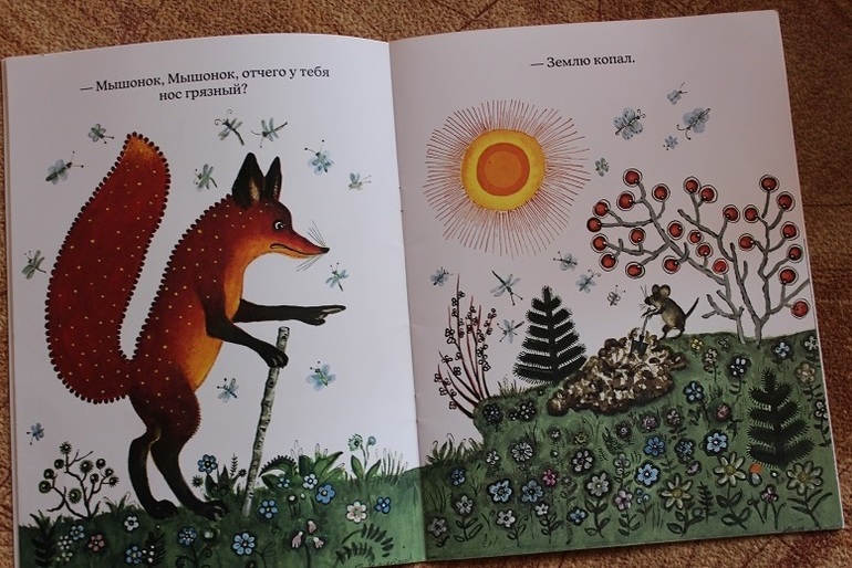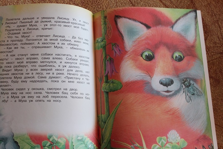 Мой сын внимательно слушает все эти истории о лютиках-цветочках, мухах и пауках. О счастлив по 10 раз на ночь перелистывать «Лиса и мышонка» в насыщенных, самобытных, густых иллюстрациях Васнецова. Он волнуется за муравьишьку, которого стряхнуло с дерева вместе с осенним листком и отнесло далеко от дома. Радуется за мышонка, в чьей кладовочке полно зерна и сыра. Смеется над нелепой мухой, возмечтавшей о коровьем хвосте. Понимает, оценивает, не перебивает.