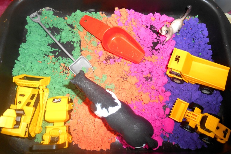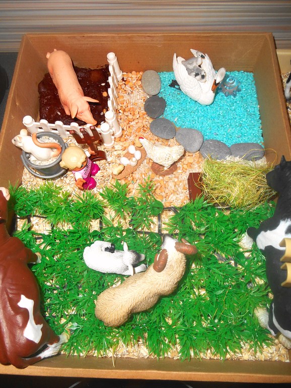Наполнение разное: крашенный рис-это вода в пруду, белый рис и горох,мука+какао+ вода-грязь для хрюшки, травка из фикса и всякие камушки, галька, ведерки, вилы, грабли, лопаты,фигурки, лего человечки. Быстро и интересно.