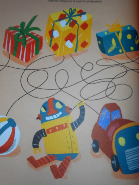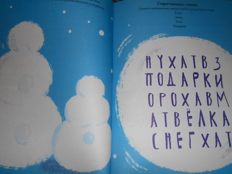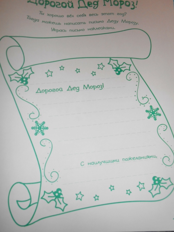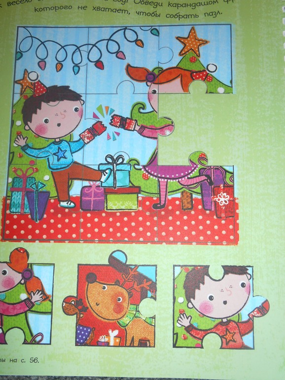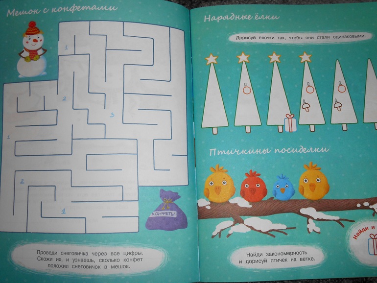 Тетрадь по размерам больше двух предыдущих, страниц намного больше, бумага качественная, как всегда в принципе у клевера. Еще меня очень радует, что в тетради наш Дед Мороз и Снегурочка. Рисунки тоже достаточно хорошие, некоторые рисунки мне не очень нравятся, из-за глаз у животных и кукол, на вкус и цвет конечно, но благо таких картинок мало, цвета приятные, мягкие, ну и собственно задания тоже хорошие. В этой тетради с многими заданиями справится 3 летний ребенок, даже с большей частью заданий (украсить наклейками, разложить вещи деда мороза и снегурочки тоже с помощью наклеек на разные полки, рассортировать письма по цветам в нужные почтовые ящики, найти что либо на картинке, раскрасить, обвести по линиям, раскрасить елочку следуя подсказкам-цифрам, сосчитать, дорисовать, найти отличия, кто что ест, продолжи ряд, что внутри подарка, определить по очертаниям, вести отсчет до нового года и так далее). Есть несколько заданий на постарше, может 5 максимум, где нужно найти слово среди множества букв и прочитать, посчитать и вписать цифру, нарисовать опять часовую стрелку, показывающую что до полночи осталось 5 минут, нарисовать деда мороза. Опять же можно и эти задания сделать вместе с ребенком, который не умеет читать и писать цифры, можно искать слова по принципу лото, посчитать предметы, попросить ребенка соединить точки (вы их заранее сделаете) и он получит ту или иную цифру.Так что можно смело в 3-4 года заниматься по ней со своим малышом. Где то помочь, прочитать, объяснить задания и все, наслаждаться совместным полезным времяпровождением. Хороших Вам занятий и интересных книг и пособий.