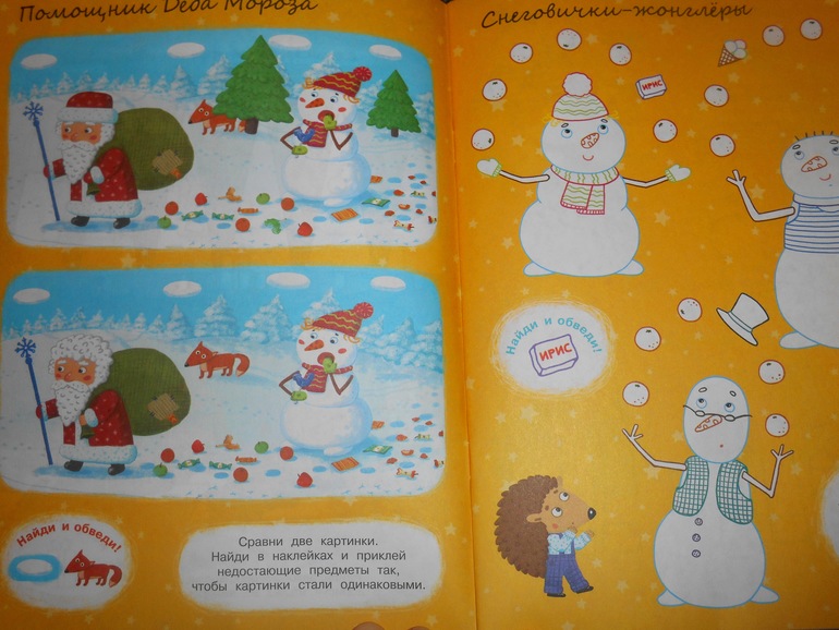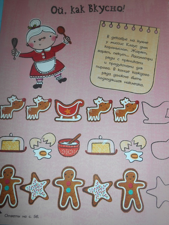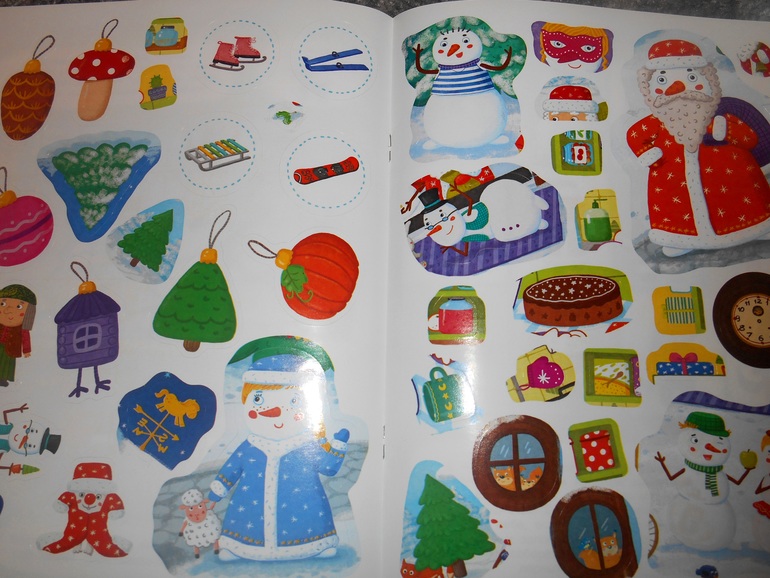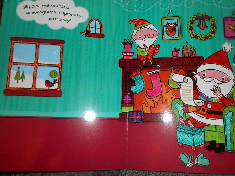 Тетрадь хорошего качества, плотный картон, глянцевая обложка, красивые рисунки, не раздражают, 4 листа с наклейками, наклейки не многоразовые, но я проверила с глянцевой обложки они отклеиваются и даже с обычных листов в самой тетради, конечно после многократного использования они будут уже не пригодны. В конце разворачивается обложка в панораму(с одной стороны упряжка с оленями и эльфами, с другой стороны комната Санты-Клауса), можно наклейки наклеить, украсить, придумать историю, а можно сделать украшения из пластилина и так же приклеить вместо наклеек, т.к страница, которая разворачивается глянцевая. Большое количество разнообразных и интересных заданий (украсить венок, повторить рисунок по клеточкам, продолжи ряд, найти отличия, лабиринт, что то дорисовать, найти лишнее, посчитать, украсить наклейками, вырезать гирлянду, сделать маску и еще много всего), с которыми справятся дети разного возраста, так что тетрадь долгоиграющая. Что то можно поделать в три года, но лучше думаю с 4 лет и далее. Хорошо подойдет для адвент календаря, просто можно достать нужный вам лист, т.к тетрадь на спирали, или просто вырвать, или так давать, кому как удобно. В конце тетради есть разворот с ответами.
