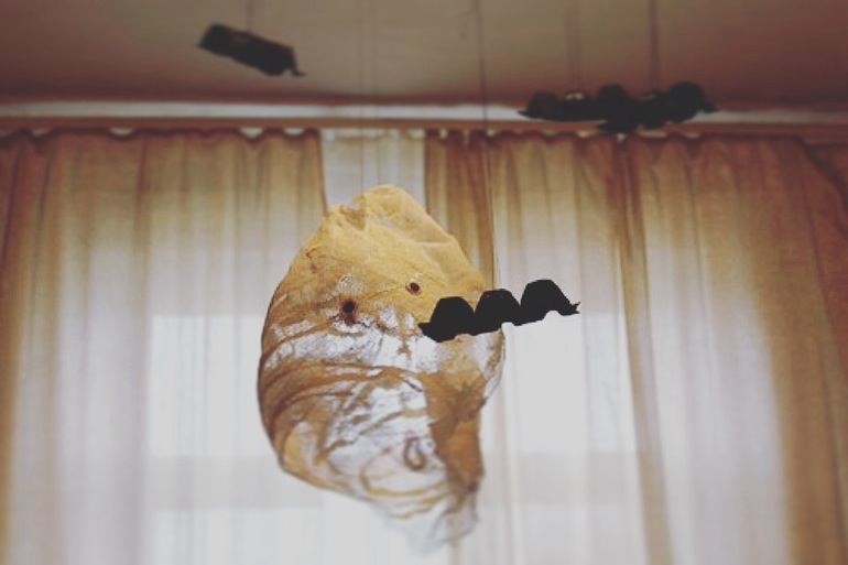 Сделали поделки:мышки из упаковки от яиц,призрак из марли: