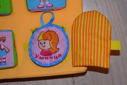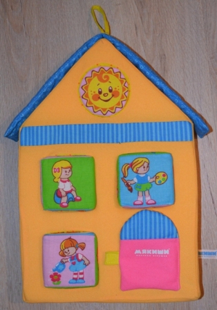 Также здесь есть всякие штучки, совершенствующие мелкую моторику рук ребенка. Это 2 большие пуговицы, которые ребенок может застегивать и расстегивать бесконечное количество раз. Сзади есть молния, с которой также ребенок может научиться обращаться. Дверка на липучке, которую можно открывать и закрывать, а за ней живет мальчик. Его одеваешь на пальцы, и герой оживает, он «может» говорить, петь песни, рассказывать что-нибудь интересное! Обе мои дочки просто в восторге от этого пальчикового мальчугана! Забыла рассказать про солнышко, которое может быть веселым и грустным, в зависимости от того выполнены ли задания. Этот домик мы периодически подвешиваем над кроваткой, вместо мобиля, это очень удобно!
