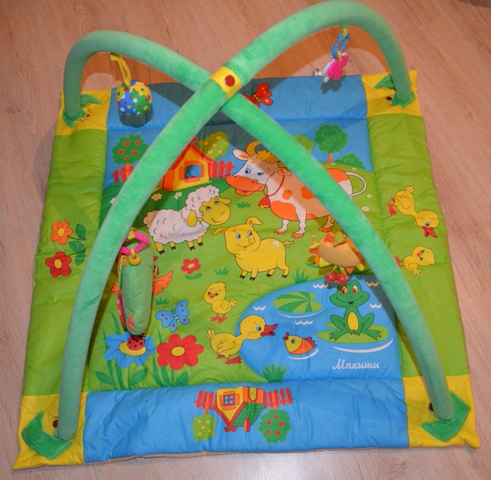 Он выполнен из 100% х/б ткани и трикотажных полотен. Наполнитель: холлофайбер, поролон, пластмассовые гранулы. В коврике УДАЧНО ПОДОБРАН размер (90 х 90 см) как раз для маленького малыша, цвет (подходит как мальчику, так и девочке), звук, яркие и понятные рисунки развивают мышление, координацию движений и совершенствуют моторику нежных пальчиков малыша.