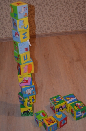 Кубики «Чей детеныш?», как и «Кто что ест» были куплены для того, чтобы научить дочку строить башню, ну и соответственно при этом не поранившись. Выход был прост - это Мякиши! Сначала только я строила, а дочка, раз за разом только и делала, что ломала мои постройки. Но дети так устроены, что они всё запоминают, просто выдают не сразу. И вот на своё ГОДОВАСИЕ дочка выдала прямо перед всеми гостями умение не ломать, а именно СТРОИТЬ башню. Надо же, решила «выпендриться» перед всеми))) а я даже не догадывалась, что уже умеет это делать!
