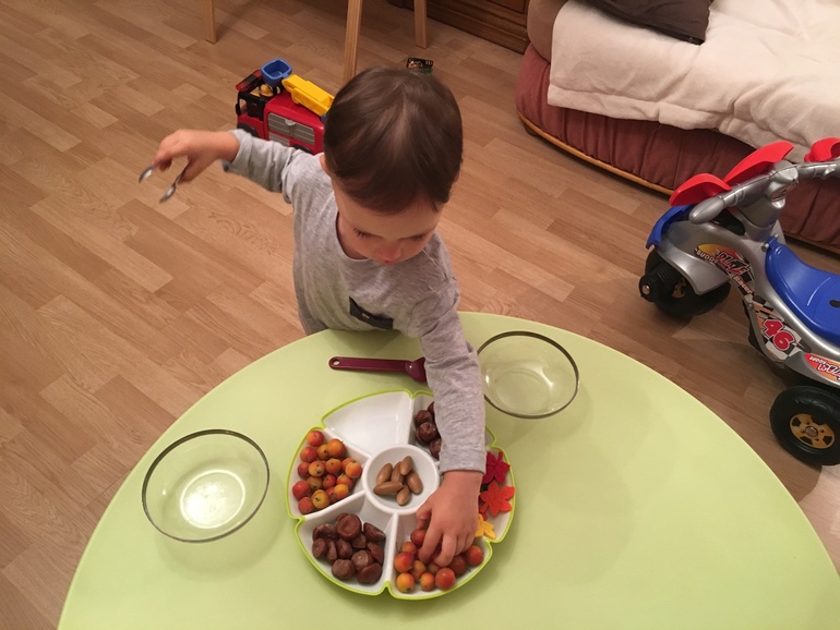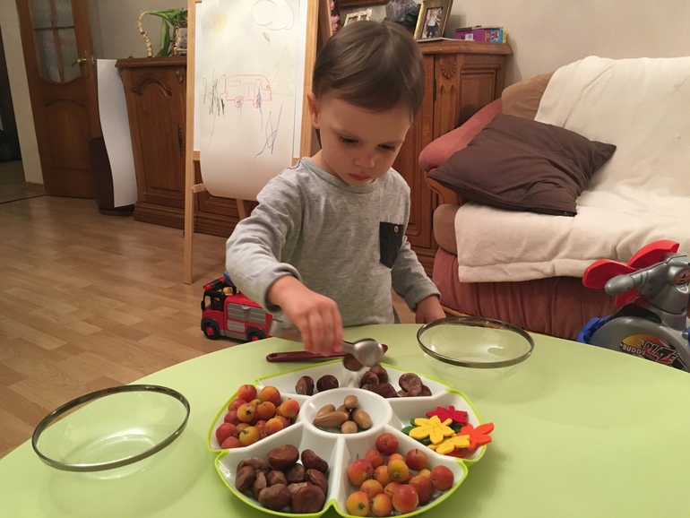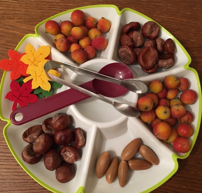 Для перекладывания ложкой и щипцами приготовила вот такую тарелочку с осенними дарами.