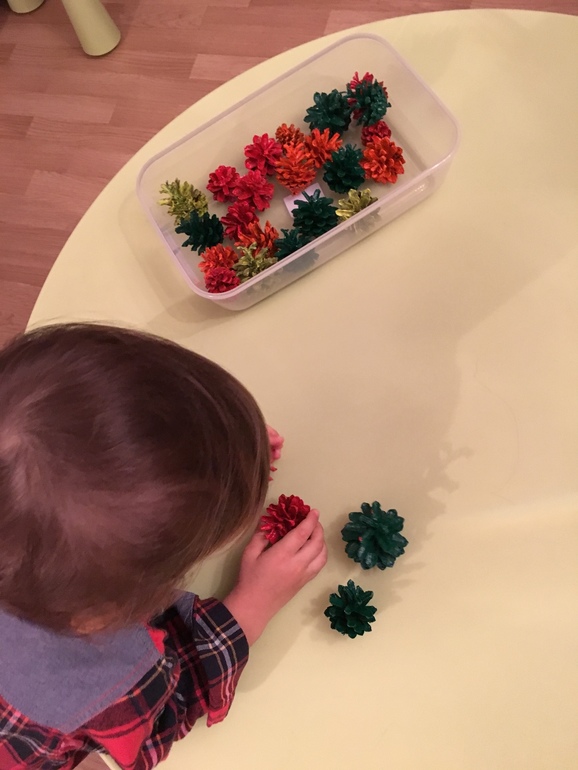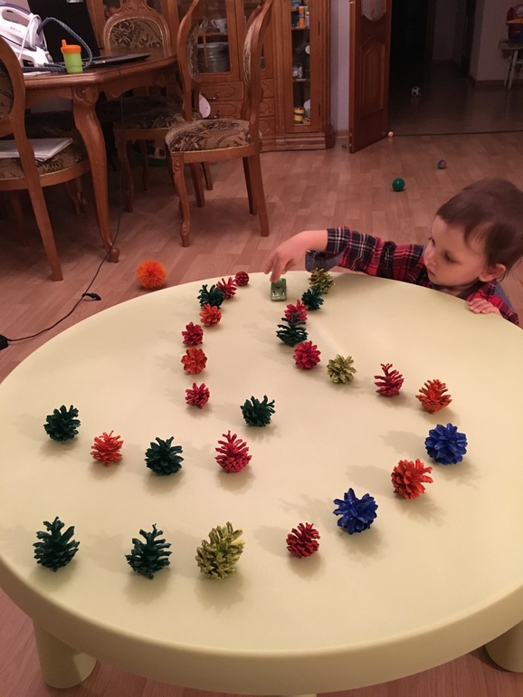 Цвета в этот раз повторяли с помощью крашенных шишек. Искали шишки нужного цвета, подбирали пары и в завершении построили сказочную дорогу из шишек и катали по ней машинки.