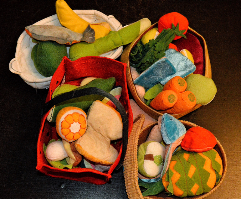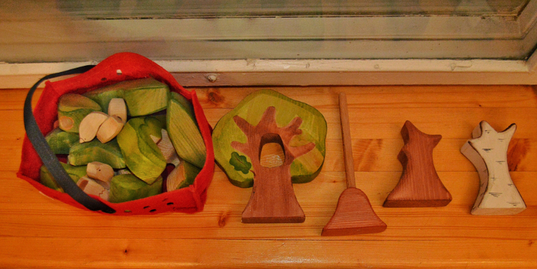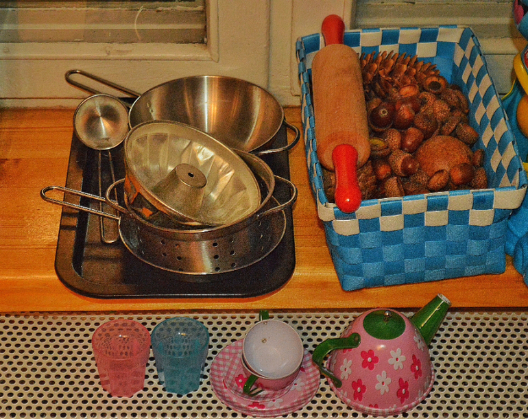 В добавок достала я из закромов икеевское добро. Я уже знаю: играет она с обновлённым материалом дня 3-4, потом охладевает и я убираю. И достаю снова либо через недельку-две, либо достаём для совместных игр. Но в данном случае, я не очень люблю уже готовые предметы в игре( я уже где-то писала об этом). Если мы "готовим" вместе, то берём для игры деревянные блоки. Они у нас играют роль всевозможных съестных припасов.