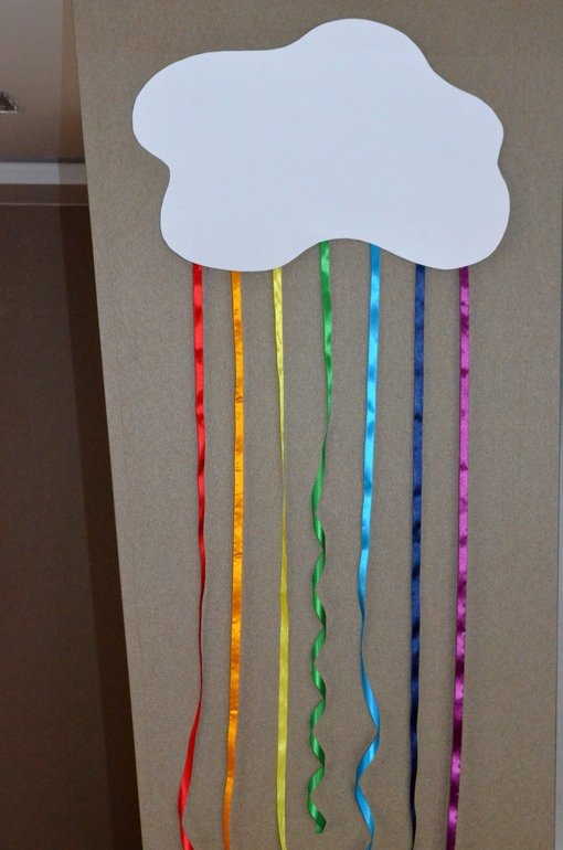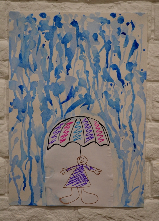 И снова дождь. Рисовали в ванной на акварельном листке с помощью сикалки, а потом деть наклеил листик с мамиными каракулями.