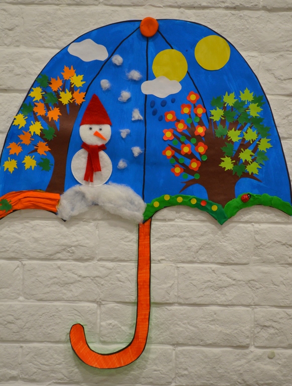 Пока делали, повторили отличительные черты каждого сезона. После зимы деть подустал и мы перешли к книжкам, танцам и прогулке, а вечером все доделали. Повесили на стену-любуемся. Рядом "лягушка-погодница", отмечаем на ней погоду за окном.