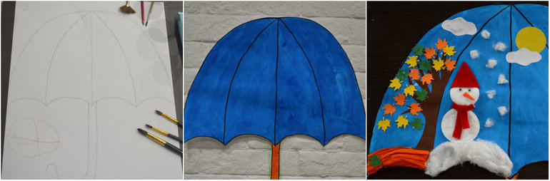 На листе формата А3 карандашом нарисовала контур, а дальше Ден раскрашивал (ничего страшного, если ребенок выйдет за края, потом все равно вырезать). Я тем временем сделал заготовки из цв. бумаги: листики, ствол дерева, облака, солнышко.... Дальше совместная работа. Т.к. за окном у нас осень, то с неё и решили начать. Здесь планировались дождевые капли пластилиновые, но Остапа понесло и он все заклеил листочками:))