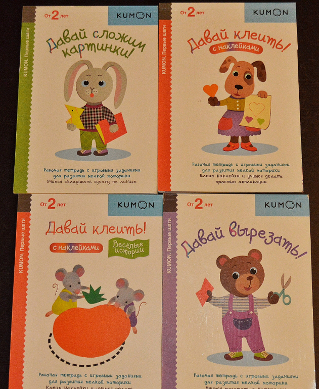 4. Кумон. Эти тетради стали уже именем нарицательным))) и только ленивый о них ещё не слышал))) Все задания расположены в порядке от простого к сложному. Незамысловатые картинки, стимулирование разных моторных навыков вкупе с огромным количеством вариантов, делают их просто незаменимыми! Я их рву по листочку))) и использую либо в совместном Шичида-занятии, либо на столиках для самостоятельной игры. Вместе мы просто за них садимся редко. Аппликации, проводилки и тп ребёнок уже в состоянии сделать сам, но при условии, что мама уже знакомила малыша с этими видами деятельности. Лично мне они не интересны. Вместе с Дашей мы мастерим что-то более сложное, с чем потом можно поиграть, и что нравится нам обеим.