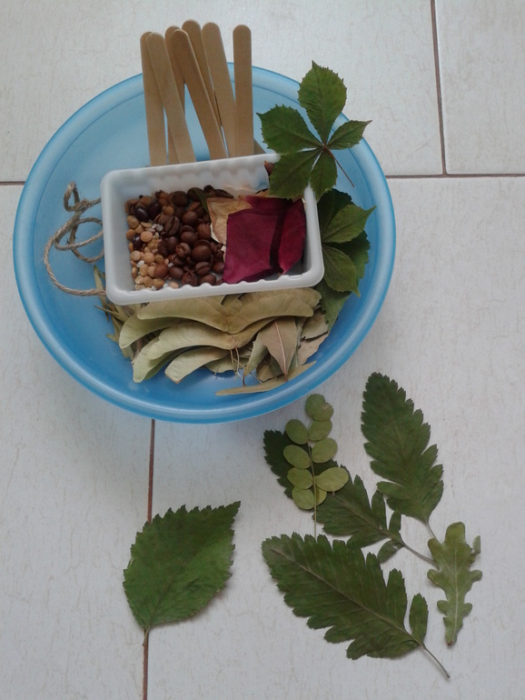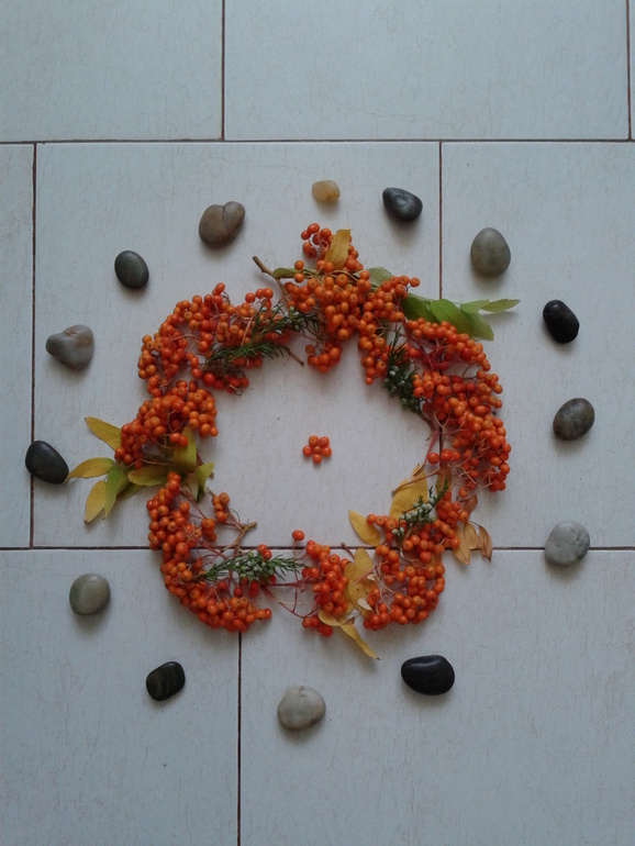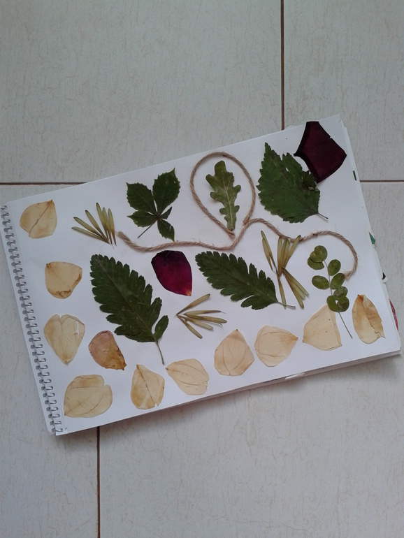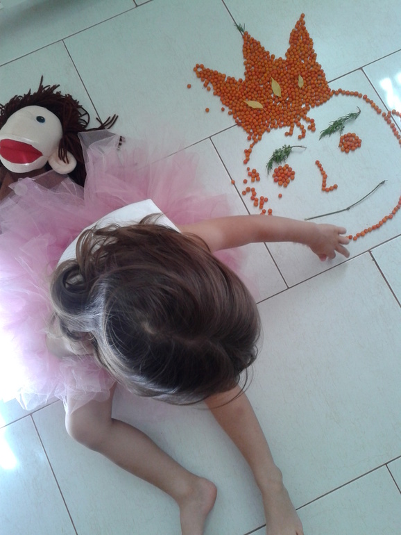 Для ноток я мазала бумагу клеем, дочка наклеивала брусничные листочки, а лепестки это уже свободное творчество дочки. Вот такой получился мотив.