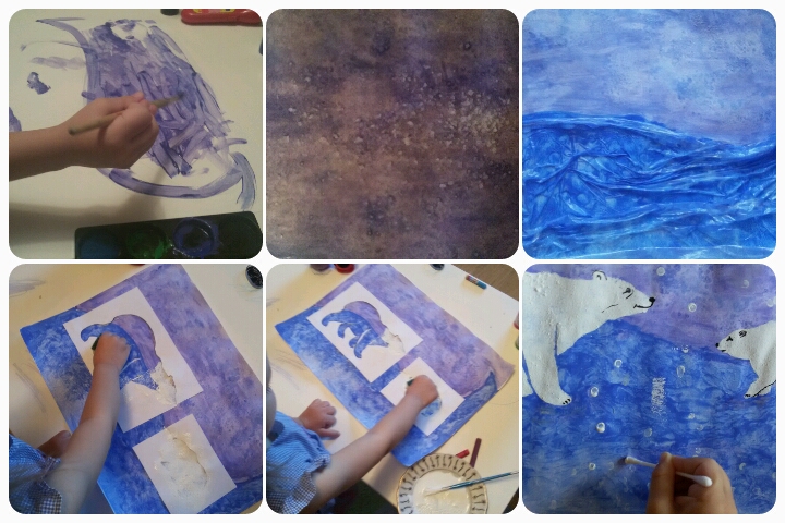 2.Я вырезала трафареты белых мишек, потом при помощи пластилина приклеила трафарет на фон. Развела белую гуашь, чуть добавила сухого гипса, чтоб фактурнее получилось, дала Саше губку и мы стали наносить эту смесь на мишек. Дали подсохнуть. Сняли трафарет.