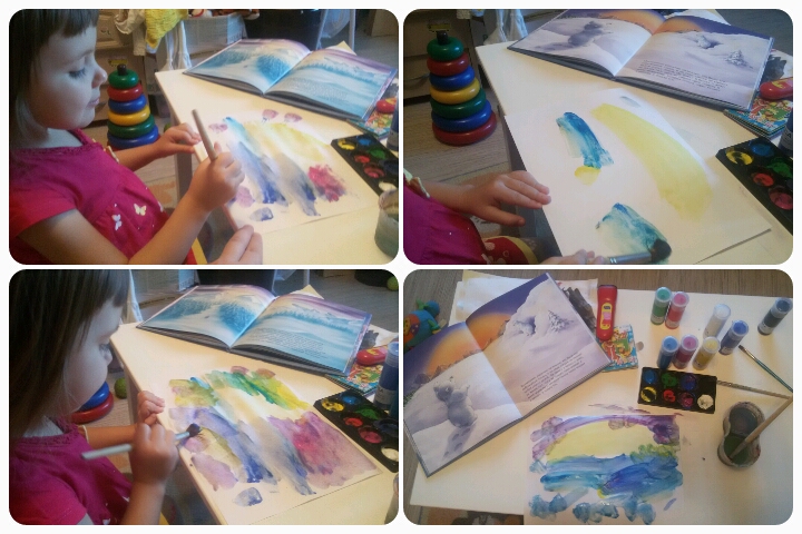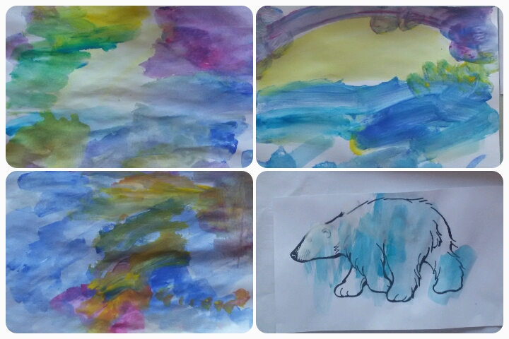 Вот что у нас получилось, слева направо: Зима; Снег и солнце; Северное сияние;, Белый мишка ( просто раскрасили). Работа полностью Сашина!!!!!