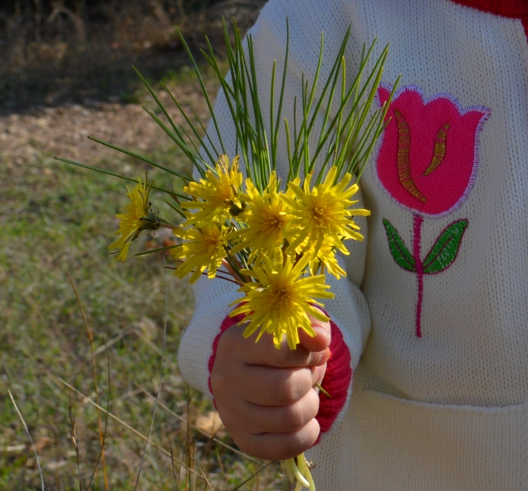 А мы гуляем! Собираем букетики из цветов и листьев)