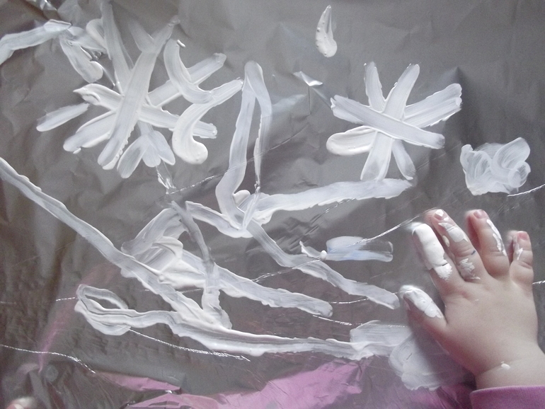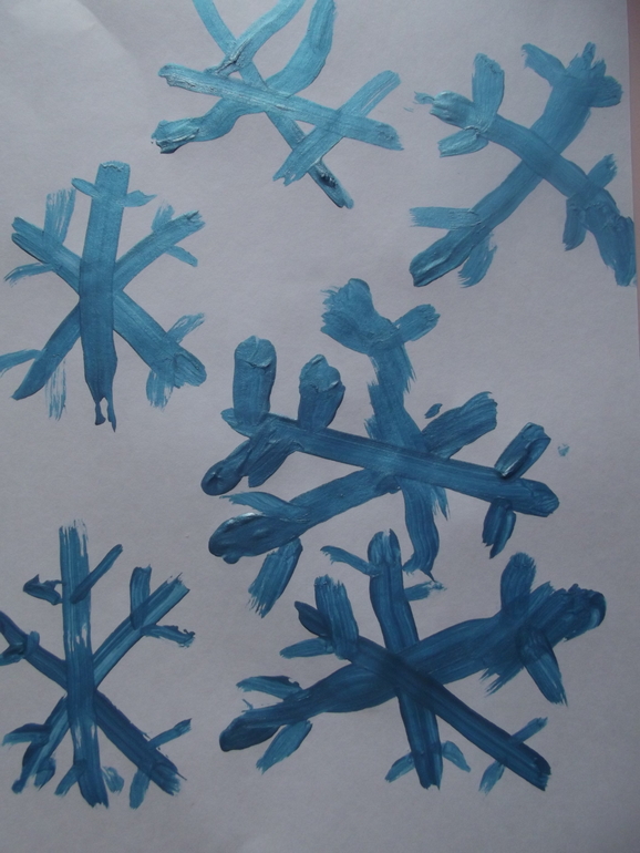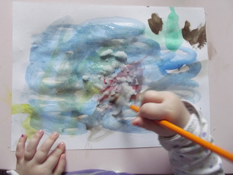 Рисовали морозными красками.Сначала раскрашиваем лист акварелью,затем сверху рисуем солью,разведенной кипятком.