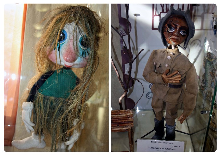 В холле нас провели по музею с куклами и немного рассказали о них. Там есть очень старые экспонаты 1983 г, 1990-94г.г. (могу ошибаться). Эти куклы отличаются от современных манерой исполнения (лица, глаза, ткань). Видно, что они немного пожелтели. Есть даже послевоенные игрушки, отображающие характер той эпохи, так фашист представлен в виде какого-то металлического пугала, собранного из чего попало, схематичный и без лица. А еще, есть куклы привезенные из-за рубежа и из театра имени Образцова, они тоже очень характерные и отличаются от остальных.