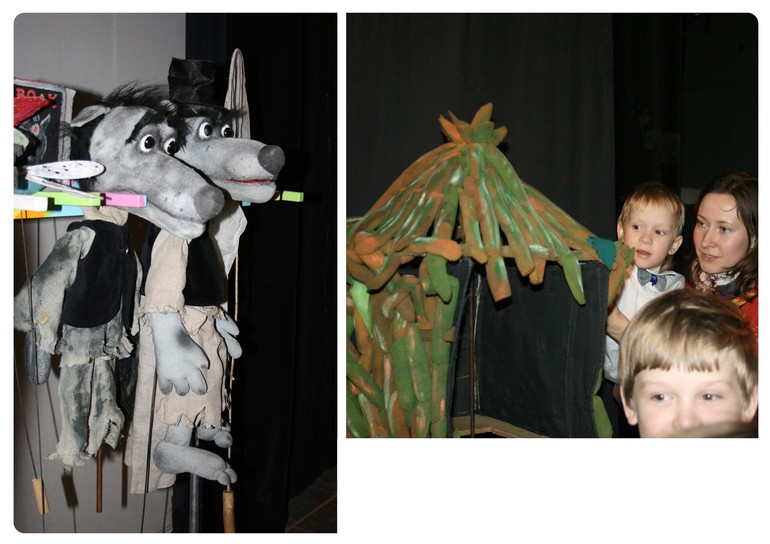 А потом мы отправились в зал, за кулисы, откуда, только что, нам показывали представление! И в каком восторге был сын, когда домики поросят удалось пощупать и даже заглянуть внутрь, рассмотреть Волка, висящего на специальной вешалке и ждущего следующего сеанса, а так же прочие атрибуты и декорации сказки.