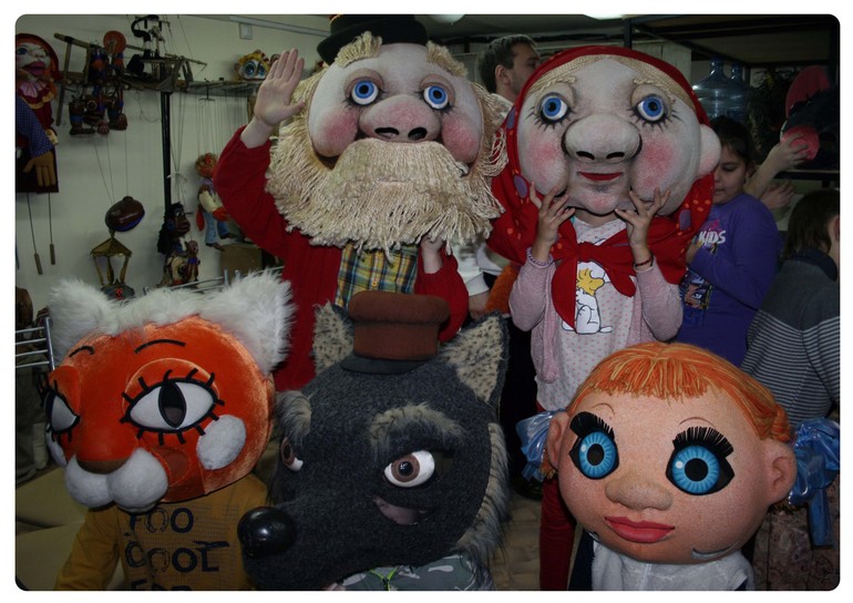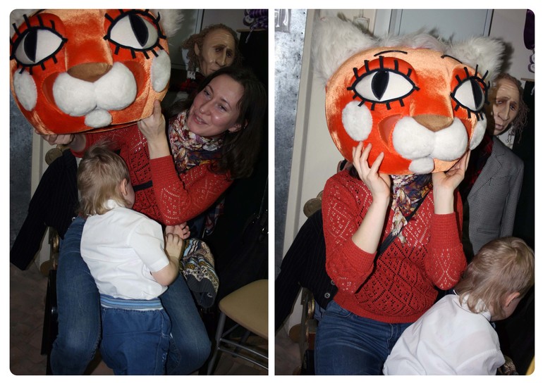 В комнате, на полках, помимо всех прочих кукол, лежали огромные головы от ростовых кукол. Вот их нам разрешили даже примерить! Росте досталась голова Тигра.