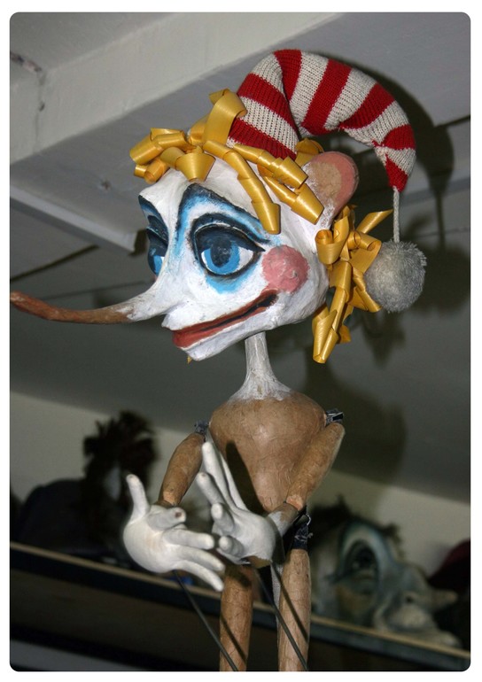 Сын очень оживился, когда сказали, что здесь есть кукла Буратино (мы как раз читали книгу «Золотой ключик»). Не смотрите на то, что он так раскрашен. Почти все куклы имеют боевую раскраску, чтоб издалека черты лица не размывались. Множество софитов в зале дают тень на лице и растушевывают контуры.