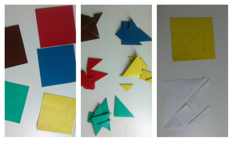 Теперь я немного усложнила задачу. Для начала сделала из плотного картона несколько танграмов разных цветов, а также несколько вариантов из простой белой бумаги.