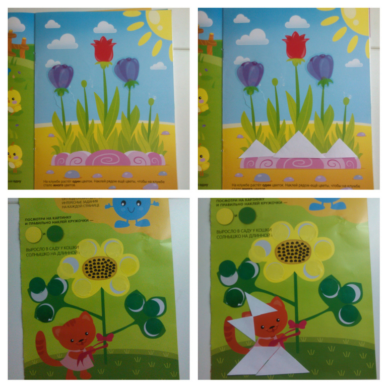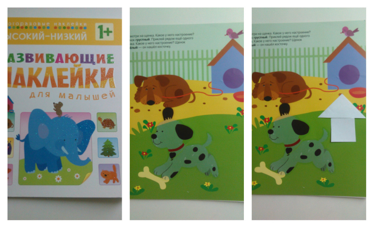 Для занятий беру использованные пособия, например с наклейками. Из белых бумажных фигур приклеиваю что-нибудь на картинке и выдаю Соне один цветной танграм. Она должна выбрать из него нужные фигуры и положить их на соответствующие места на картинке. Самые простые получаются легко, посложнее иногда еще нет. Например, надо сделать будку для собачки.