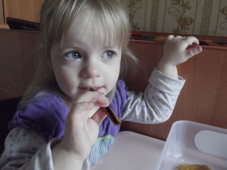 Нюхали новогодние запахи - корицу,какао,имбирь,кожуру апельсина.