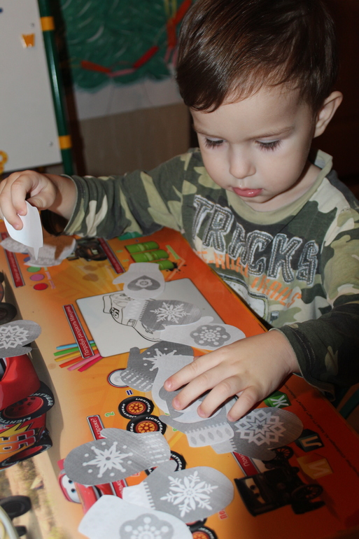 2)Творческим заданием стала аппликация. Делали варежки, украшая их готовыми снежинками и снегом.