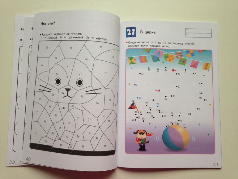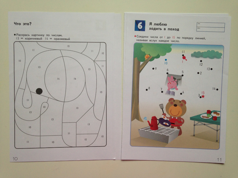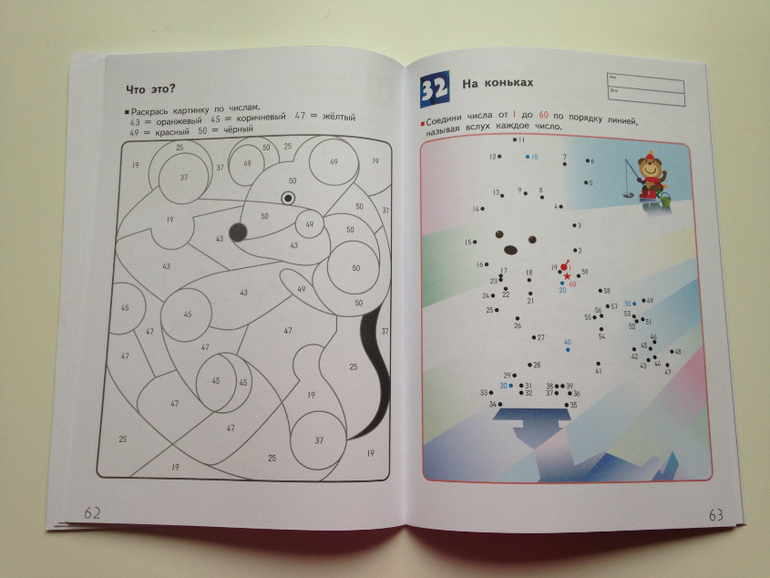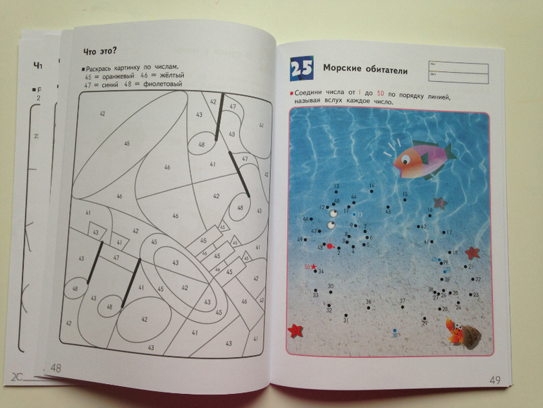 Отличная книжка, хоть нам больше по силам пока одна ее часть: та, что вы видите слева. Мне пока такие задания не встречались, Диме, соответственно, тоже. Поэтому пошли на ура. Нужно раскрасить определенным цветом кусочки с конкретной цифрой, в итоге получится какой-то рисунок.