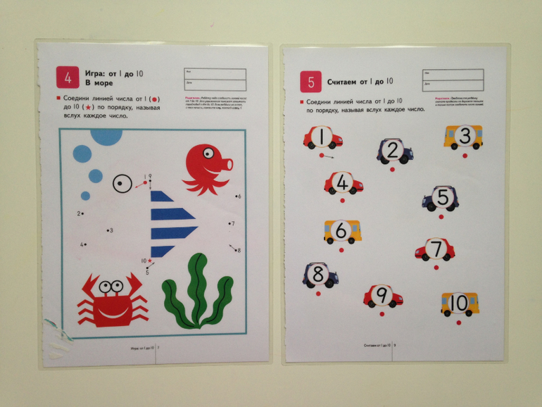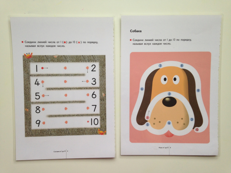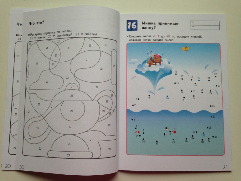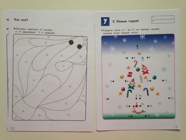 Вторая часть заданий посложнее, тут все опять очень быстро меняется. Несколько страничек, где нужно соединить от 1 до 10, а потом сразу до 15, 20 и так далее. Даже, учитывая то, что Дима вроде как понял как вести счет после "10" (кстати очень помогает адвент-календарь на декабрь, как от зубов до 31 теперь отскакивает)), соединить все красиво не получается.