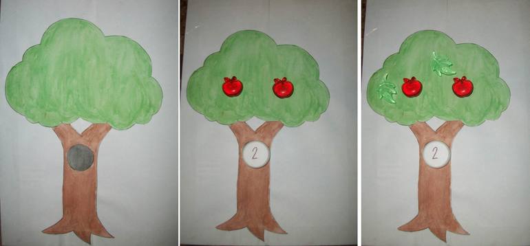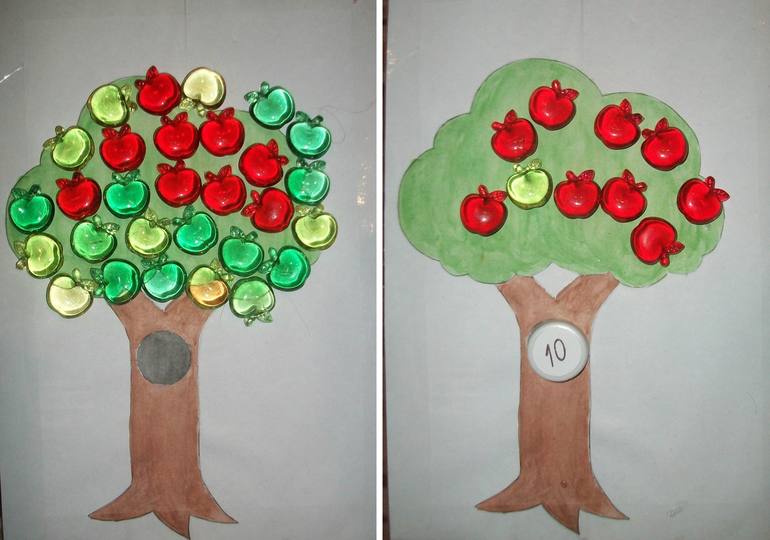 Позже я сделала рисунок "Дерево". У дерева есть дупло, на которое кладётся крышка с цифрой. Соответственно такое же число яблок нужно положить на дерево. Кроме яблок, можно ложить и листочки в нужном количестве.