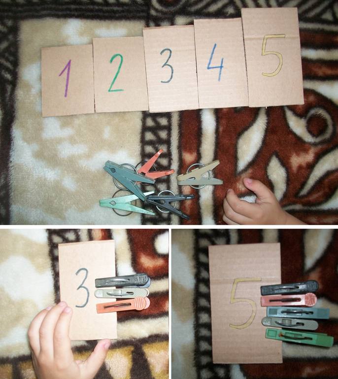 Еще я сделала простейшие счетные карточки с использованием прищепок. Карточки также можно и просто складывать по порядку - по мере возрастания счета они становятся длиннее.