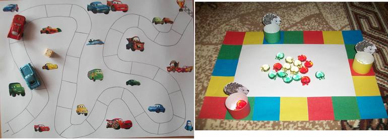 А когда сын уже более-менее запомнил цифры-точки на игральном кубике, я сделала ему друг за другом 2 игры-ходилки: "Тачки" (про неё писала тут) и "Ёжики" (тут)