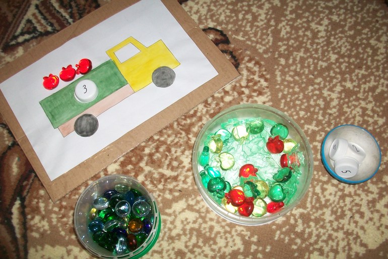 Позже на обороте была сделана еще картинка с машиной. Машина тоже возит яблоки, ну или камушки (по настроению, благо счетного материала у нас достаточно). Считали и раскладывали цифры мы тогда только до 5.