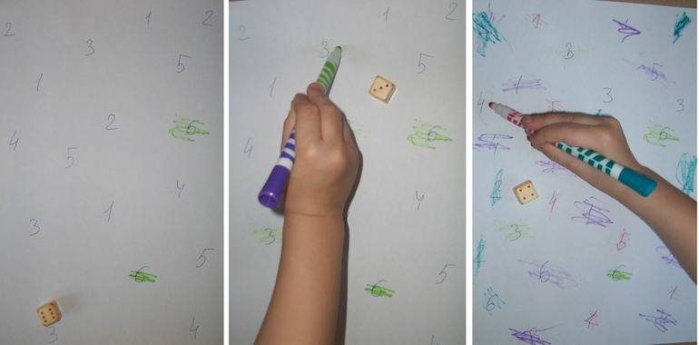 Потом стала приучать его к запоминанию цифр-точек на кубике. Бросаем кубик и зачеркиваем нужную цифру на листе бумаги.