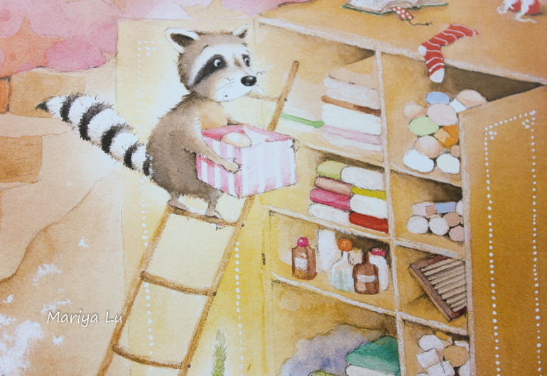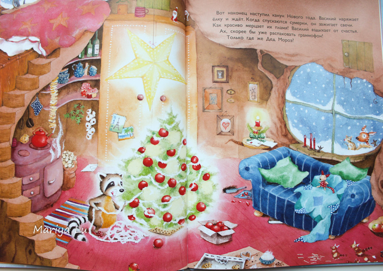 И вот, украсив елку и приготовившись к празднику Василий сидел и ждал подарка, но увы, заветной коробочки так и не оказалось рядом с его дверью. Решив,что это недоразумение и такого просто не может быть енот отправился на поиски подарка.