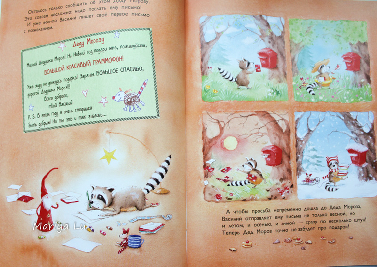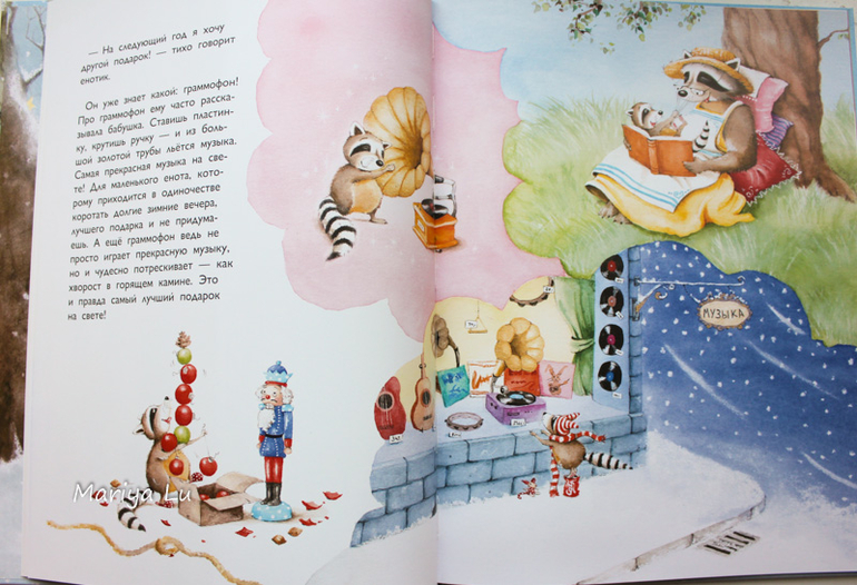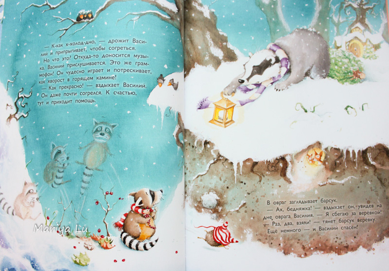 Единственное,присмотритесь к переводу. Он, в принципе ничего, язык не спотыкается, читается ровно. но мне привычнее читать,когда рассказ ведется от третьего лица. Например " тихо сказал енотик" вместо "тихо говорит енотик", " Василий покачал головой" вместо "василий покачал головой" и т.д. Но на второе-третье прочтение я уже приобвыкла и не так к этому цеплялась. Ребенок ничего не заметил, может быть потому что такой перевод создает момент присутствия здесь и сейчас?