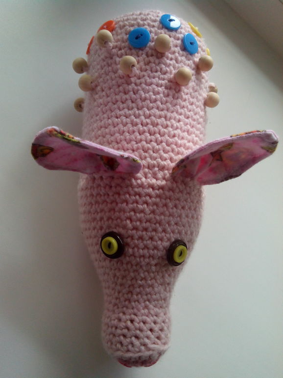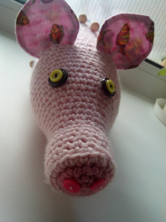 3. "Молочный" поросёнок. В ход пошла бутылка из-под молока) Задумка очень простая, но интересная. Поросёночек неслабо гремит, тк внутри много чего интересного) Украсила его деревянными бусинами(они не пришиты, а нанизаны на нить), яркими пуговицами от 1 до 5! Не успела поросёнку пришить ноги, но они уже связаны и ждут своей очереди!