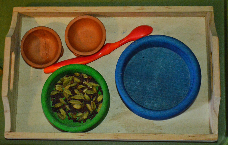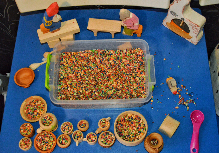 На неделю Дашу увлекли крупы. Давно не доставала, соскучилась. Посудки у нас очень много глиняной и деревянной, ну и атрибутики для ролевых игр тоже предостаточно.