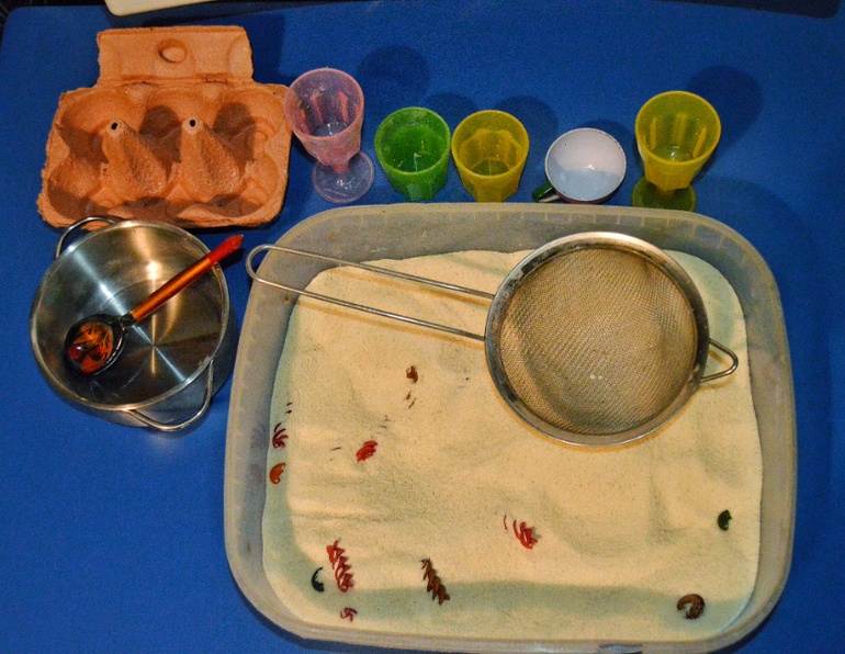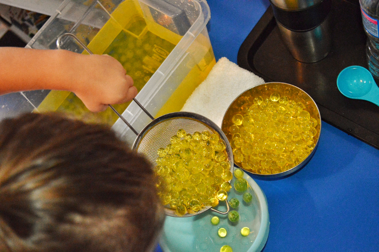 Кроме того из сыпучестей был ещё гидрогель и манка. Для этих игр отлично подойдёт ситечко: либо просто просеивать муку, либо выуживать шарики из воды.