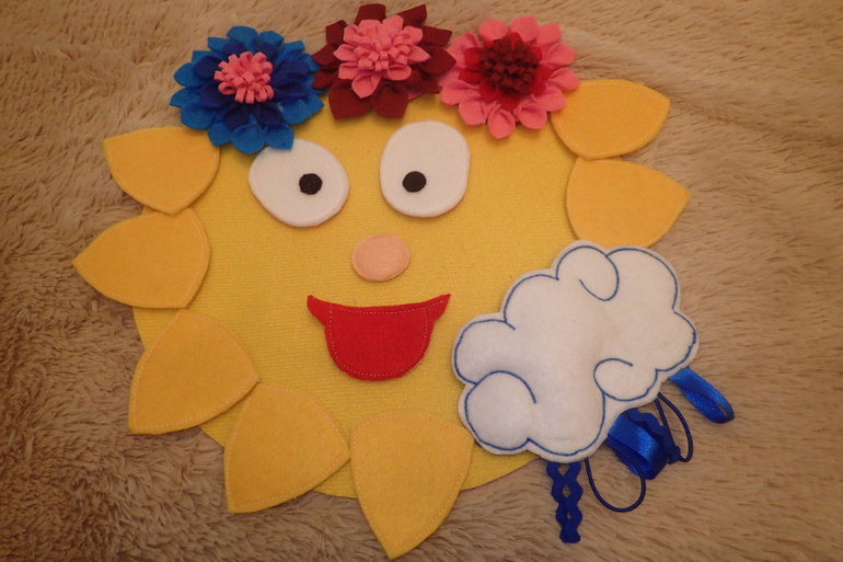 Основная часть состоит из велкро ткани. Поэтому к солнышку может крепиться все что угодна (и даже ботинки на липучках).