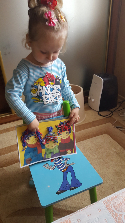 Сегодня делали деткам вот такие шапки - зима ведь, надо утепляться. В моей воображении Полина должна была красиво разложить ниточки….но я понимаю, что у нее на этот счет другое мнение - когда «живенько», тогда интереснее)).
