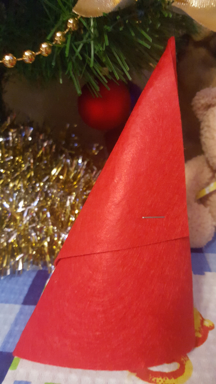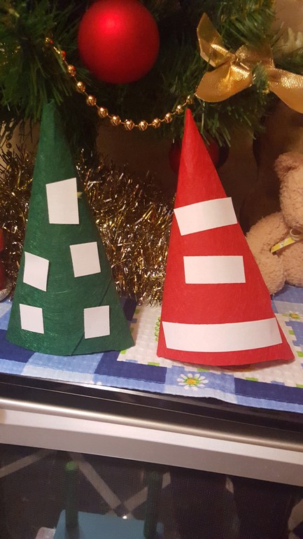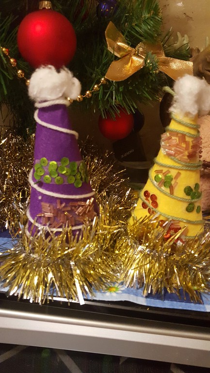 Для того, чтобы сделать вот такие елочки, маме необходимо из фетра сделать такие колпачки (как кулечки для семечек, сзади скрепив степлером).
