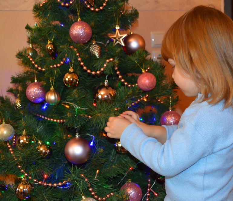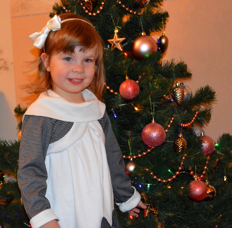 Катя в нарядном платье у нашей елочки)