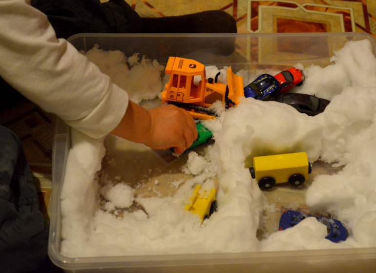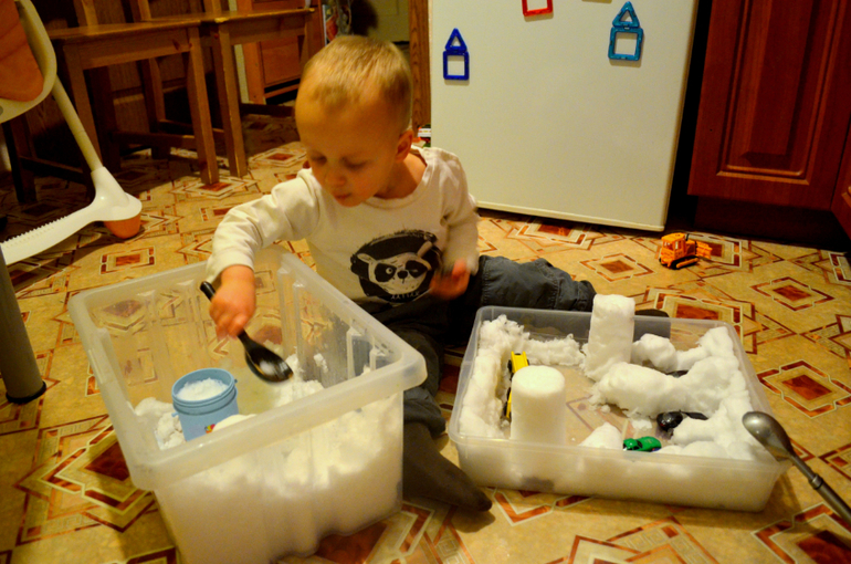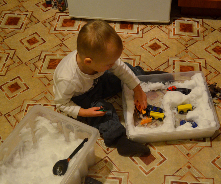 Дима знал, что я ходила за снегом и уже с нетерпением ждал начала игры. Мы собрали маленькие машинки и построили парковку из снега. Малыш не очень хотел морозить ручки и перекладывал снег из большого контейнера в игровой большой деревянной ложкой. Но снег, конечно, поторогать пришлось)))