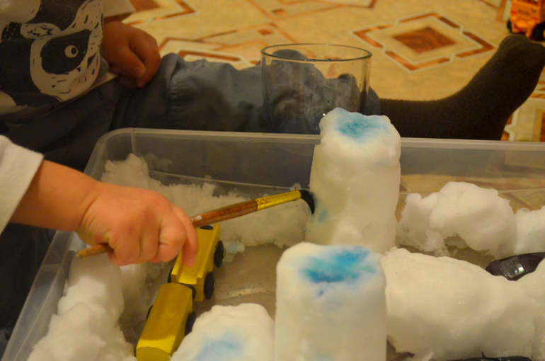 А когда этот сюжет надоел, мы стали строить башни и раскрашивать их, капать окрашенной водой и топить снег. Попутно, я обращала внимание Димы на то, как тает снег под воздействием воды, во что он превращается, на то,что снег был легким, а стал мокрым, липким и тяжелым, и на многое другое. На улице так не поиграешь. Особенно, голыми руками.