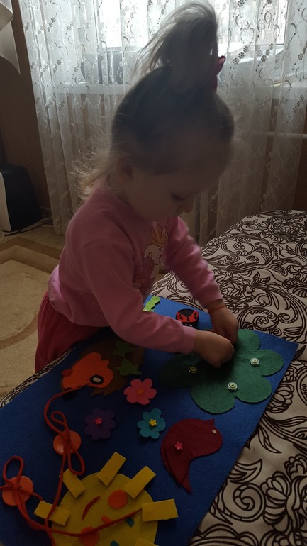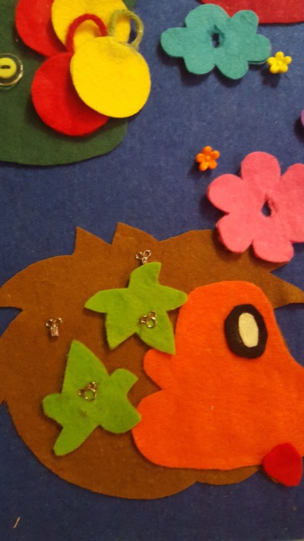 Доце очень понравилось. Даже не думала, сколько вариаций можно придумать - и вместо яблок на дерево цветочки и ежику яблочки и птичке цветочек. В общем, полет фантазии!! Кнопочки, шнурки и крючки пока плохо получаются, а вот пуговицы, липучки и молния - на ура! Так что, девчонки, творите для малышей!!!